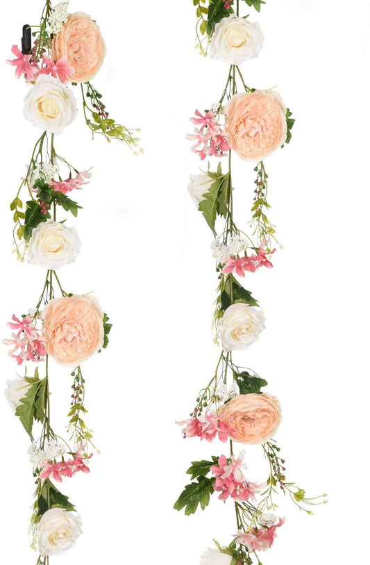 Artificial Peony Garland Flowers, Floral Greenery Garland Rose Flower Vine Garland with Mixed Peony Flowers and Green Leaves for Wedding