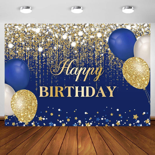 Blue and Gold Happy Birthday Backdrop Glitter Golden Dots Diamonds Balloons