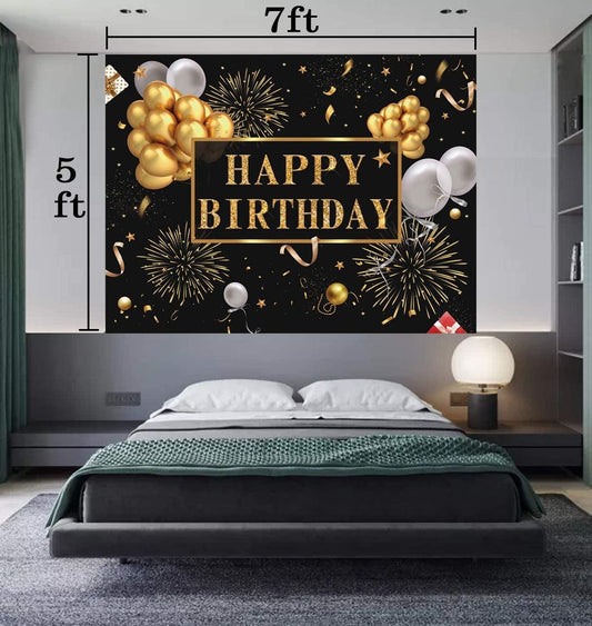 Happy Birthday Backdrop Banner Black and Gold Sign Poster Large Fabric Glitter Balloon Fireworks Sign