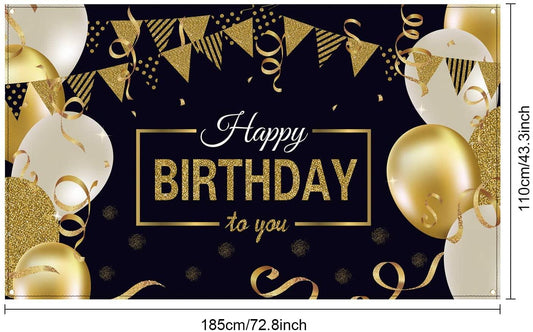 Happy Birthday Backdrop Banner Extra Large Black and Gold Sign Poster for Men Women Birthday Anniversary Party Photo Booth Backdrop