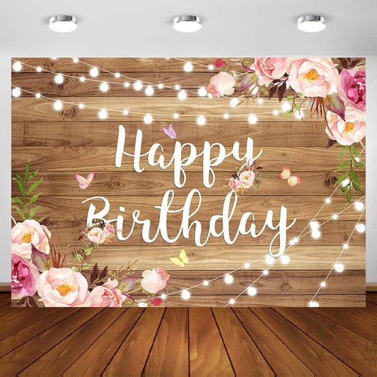 Pink Floral Happy Birthday Backdrop Butterfly Wooden Floor Watercolor Flowers Girls Women Photography Background Banner