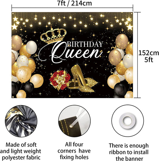 Black Gold Birthday Backdrop Banner, Queen Birthday Backdrop Background for Woman