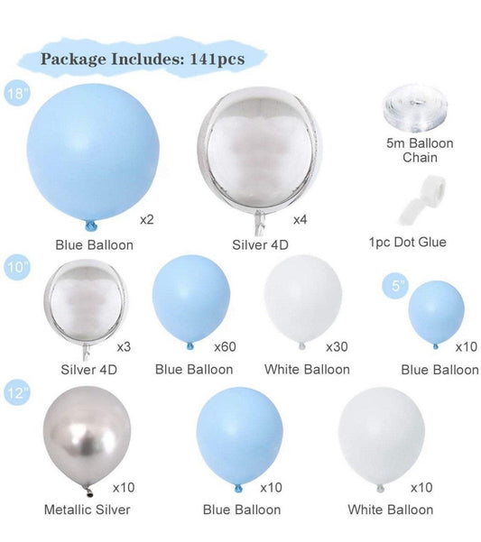 141Blue Balloon Garland Arch Kit, Blue Silver White Balloons, Silver 4D Foil Balloons, Metal Balloon Arch for Boy Baby Shower first birthday