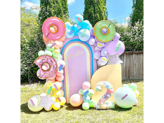 169pcs Macaron Donut Balloon Garland Arch Kit with Green, Purple, Yellow, Pink, Blue Pastel Balloons, Donuts Star Foil Balloons