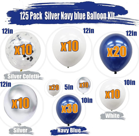 125 Pack Navy Silver White Confetti Balloons with Balloon Accessories for Graduation Party Baby Shower Wedding Birthday Party Engagement