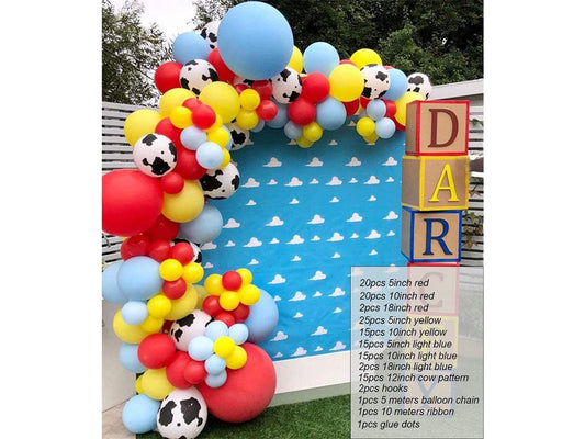 Cow Pattern Printed Balloon Arch Toy Story Theme Party Supplies 129pcs Red Yellow Blue Balloons Garland Kit for Mario Toy Story Theme