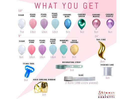Shimmer and Confetti Premium Mermaid Balloon Garland and Arch Kit. Tail Fins, Pink, Purple, Aqua, Gold, Tying Tool, Fishing Line, Tape, Glue