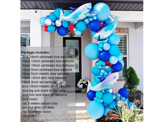 Shark Party Decorations Supplies Caribbean Blue Sliver Red Balloon Arch Kit & Garland With Shark Balloons, 115pcs For Baby Shower