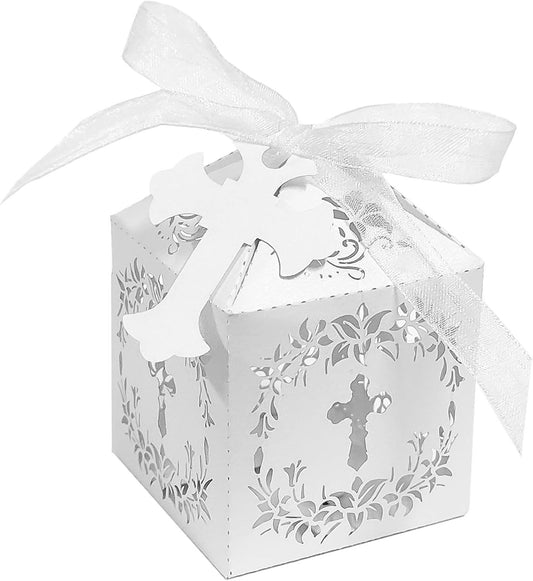 50 Pieces Baptism Favor Boxes, 2 x 2 x 3 Inches Laser Cut Favor Boxes with 50 Ribbons and 50 Cross Tags for Christian Baby Shower Wedding