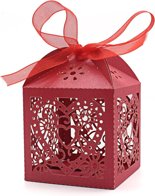 100 Pack Love Heart Laser Cut Wedding Party Favor Box Candy Bag Chocolate Gift Boxes Bridal Birthday Shower Bomboniere with Ribbons